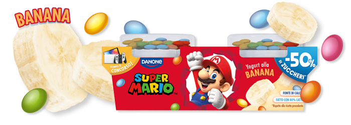 Ingredienti yogurt: yogurt, preparazione di banana 10% (purea di banana 46%, zucchero, aromi, addensanti: amido modificato, pectina; correttori di acidità: citrato di sodio, citrati di calcio, acido citrico; colorante: beta carotene; antiossidante: acido ascorbico; vitamina D), zucchero 2,3%, aroma naturale.